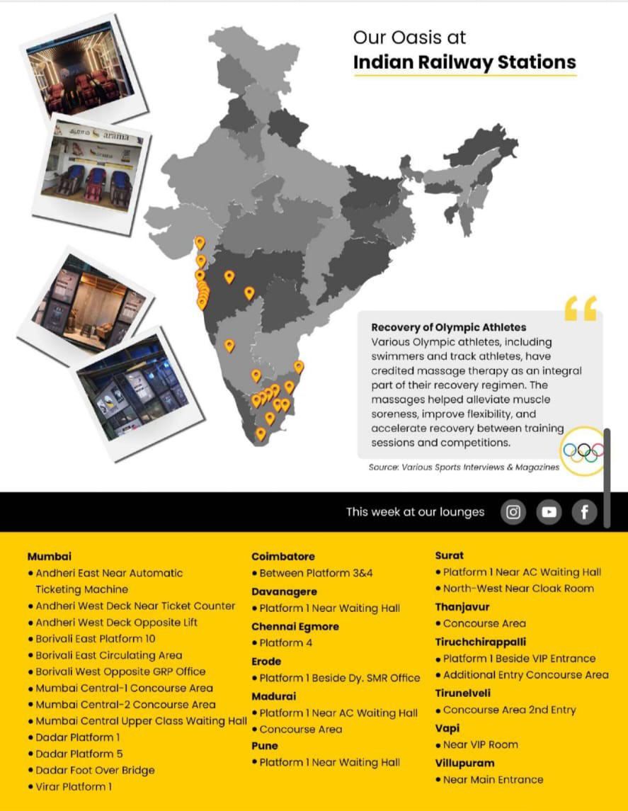 This partnership has helped integrate massage lounges at railway stations, allowing travelers to experience stress relief and relaxation before continuing their journey.